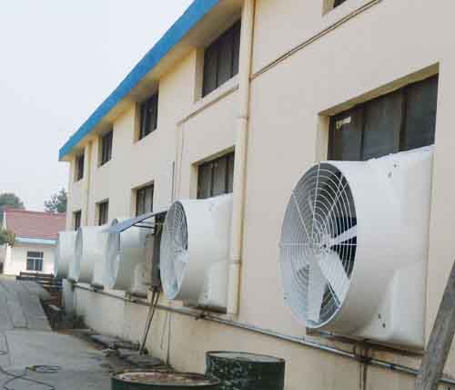 二、将负压风机安装在车间热、热区的壁面或窗上,快速排出车间内收集的高温、闷热空气,使空气循环达到通风的自然冷却效果,适用于车间面积大、工作人员多、车间整体空气循环不佳的高温闷热。